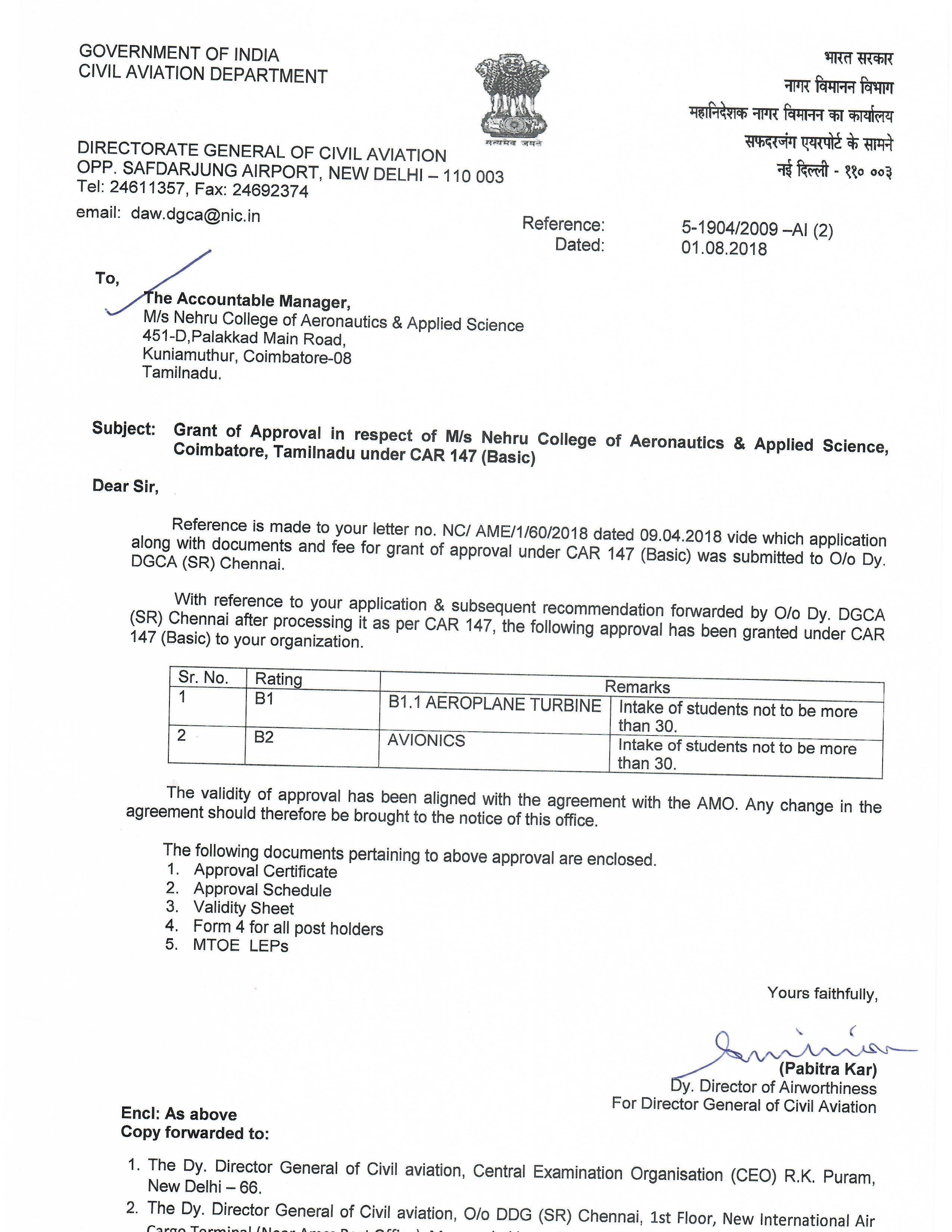 This is a practical oriented course with 40% of curriculum being practicals. Minimum 30% of practicals shall be conducted on live aircraft/ systems for which the College is having a long term agreement with AIESL, Thiruvananthapuram and Air Works, Cochin and Hosur. In the five semesters of training a total of 328 hours of training shall be provided by these MROs on live aircraft and relevant systems. Our campus is eco-friendly and ragging free where all the students are nurtured well and we are "Moulding True Citizens". More than 57 years of rich experience and profound Alumni connection with strong bonding are our strength.